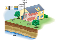 | Le captage sur eau de nappe: Le captage d'eau sur nappe connaît une demande forte auprès des clients qui possèdent des terrains exigus ou accidentés. L'eau prélevée provient des nappes présentes dans le sol, souvent à une profondeur de 10 ou 20 mètres et dont la température est constante tout au long de l'année, assurant ainsi un rendement élevé de la pompe à chaleur. |